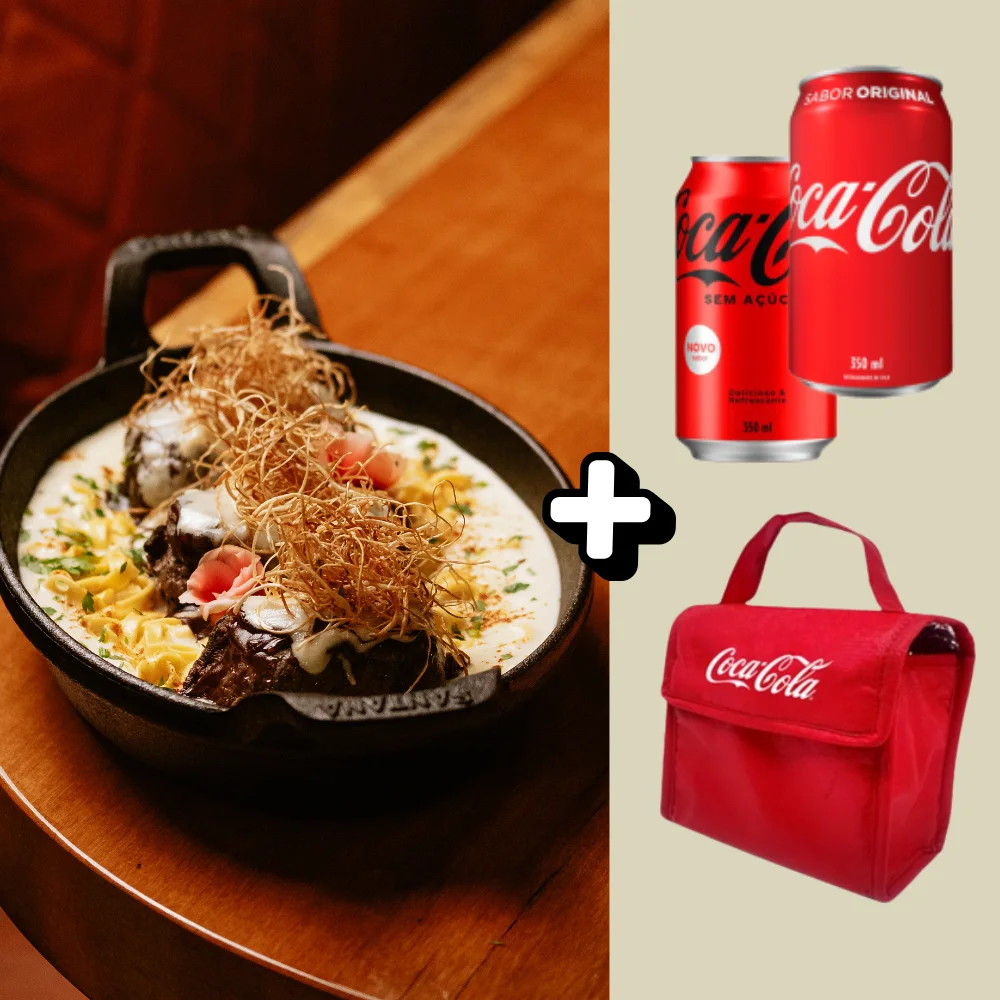 Fettuccine com fondue de queijos acompanhado de medalhão de mignon com molho demi-glace e crispy de alho-poró + 2 coca lata de sua escolha + bag térmica da Coca de brinde.