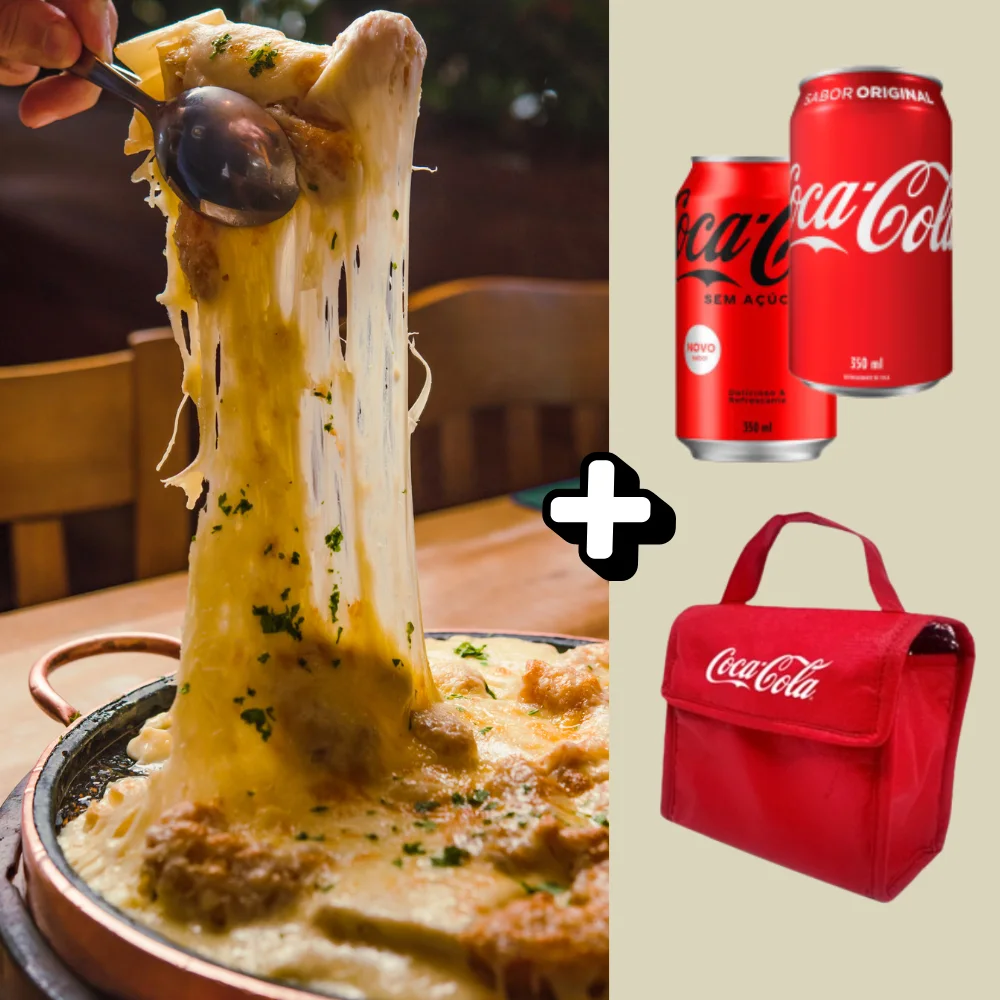Camarão empanado, palmito pupunha grelhado e molho béchamel cremoso coberto com muito queijo gratinado na pedra. Acompanha arroz branco e batatas fritas + 2 cocas da sua escolha + uma bag térmica exclusiva da Coca-Cola.