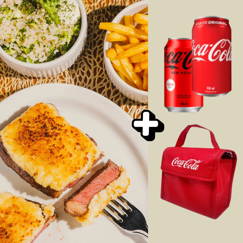 Picanha Angus grelhada com crosta cremosa de alho, acompanhado de arroz de brócolis e fritas + 2 Cocas de sua escolha + Bag Térmica Da Coca