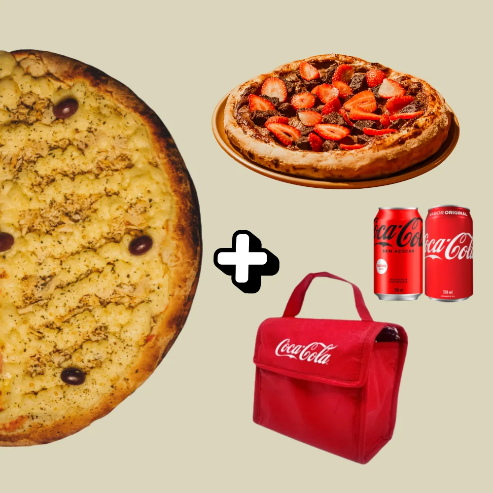 Pizza de Frango desfiado com catupiry original e molho de tomate italiano + Pizza Broto de Nutella (Base de ganache de chocolate meio amargo, brownie artesanal de chocolate em pedaços, cobertura de nutella e morangos fatiados) + 2 Cocas de sua escolha + Bag Térmica Da Coca de brinde.