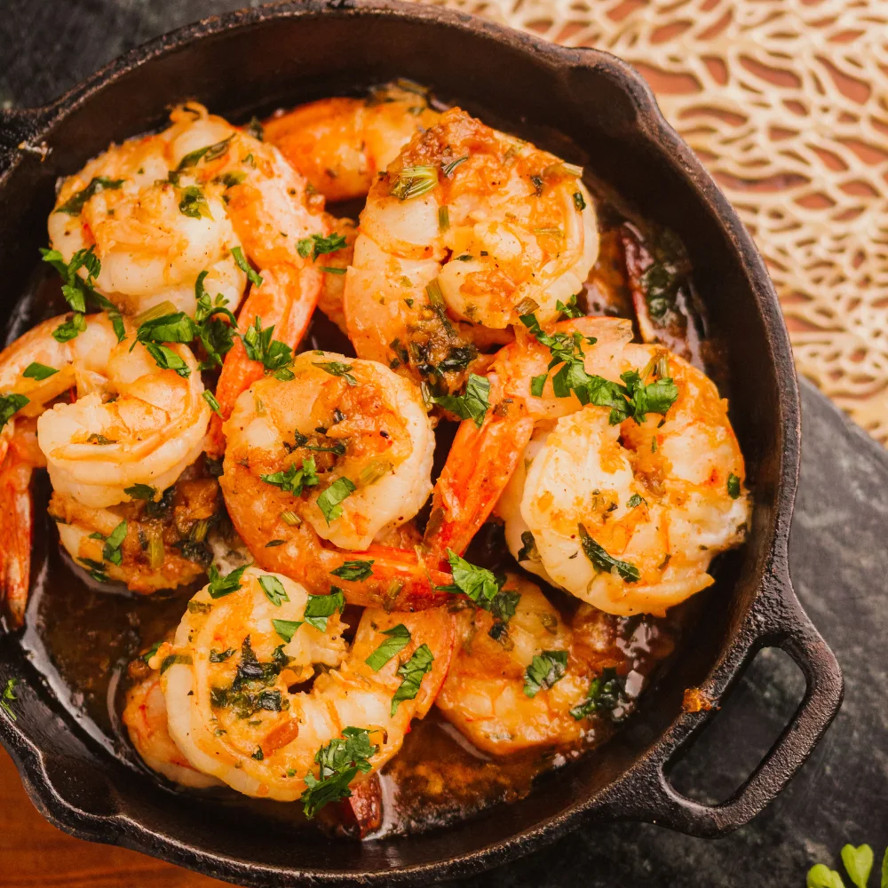 Camarões grandes refogados no alho, azeite de oliva extra virgem e ervas frescas. Acompanha pão de fermentação natural.