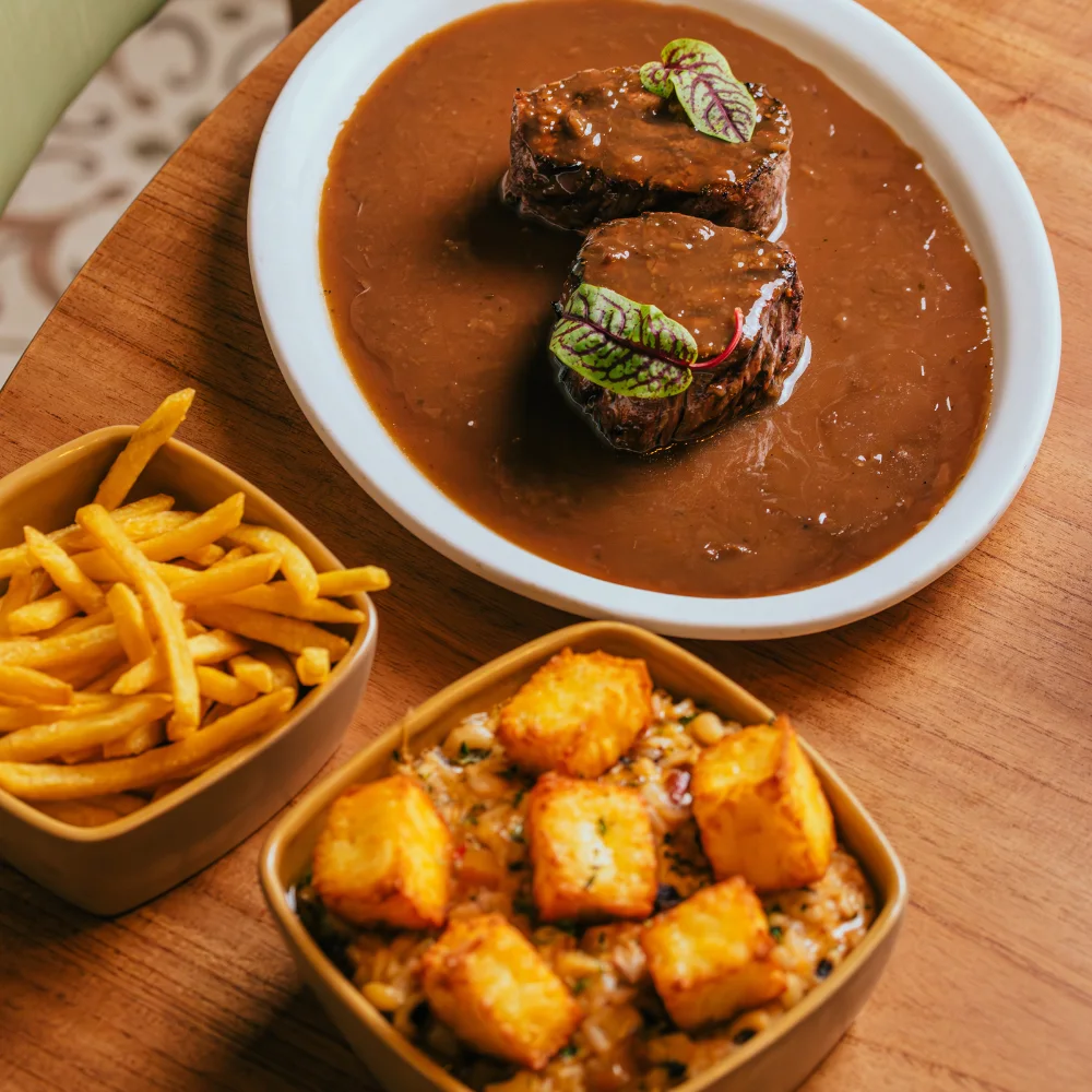 Nossa releitura desse prato que é sucesso no Nordeste: carne grelhada ao molho rosti, baião de dois gratinado e cremoso de cupim, queijo coalho, bacon, feijão-fradinho, catupiry e batatas fritas.