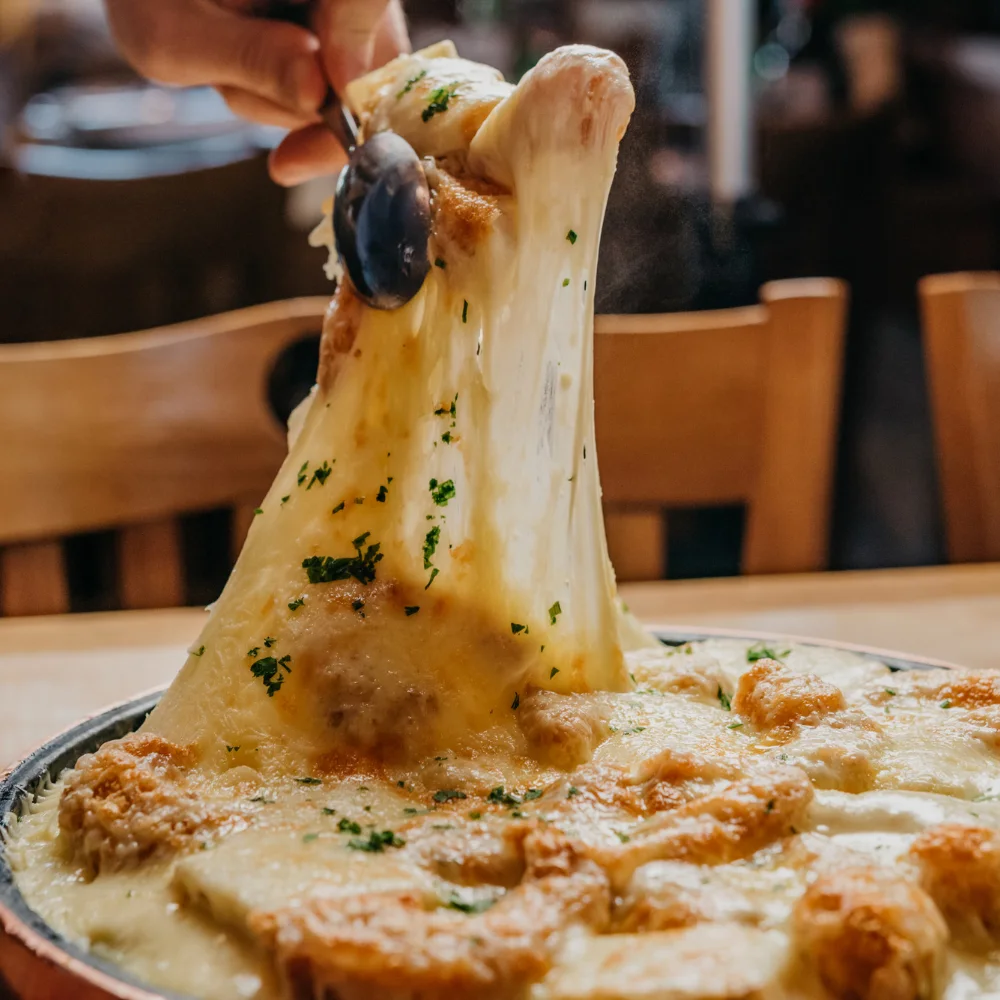 Camarão, palmito pupunha grelhado e molho bechamél cremoso, coberto com muito queijo gratinado na pedra. Acompanha arroz branco e batatas rústicas.