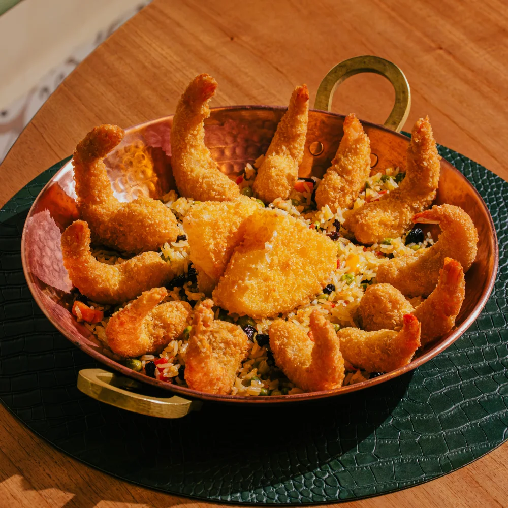 Camarão crocante na panko acompanhado por delicioso arroz à grega com toque de açafrão, batatas fritas e queijo provolone empanado.
