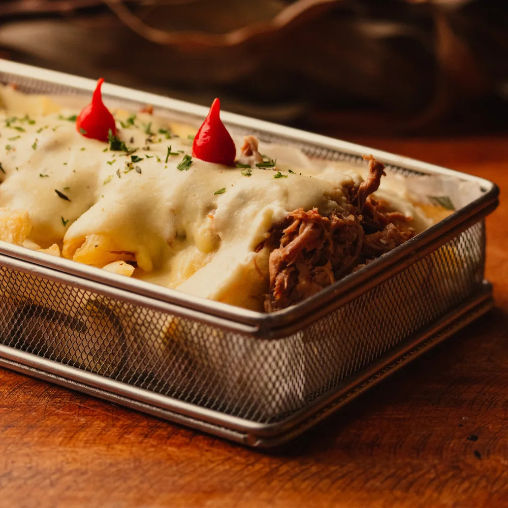 Porção generosa de batatas crocantes cobertas com nosso fondue de queijos e costela cozida lentamente, bem macia e desfiada no ponto perfeito. Uma exclusividade do Jardim que virou favorita: intensa, cremosa e perfeita para compartilhar.