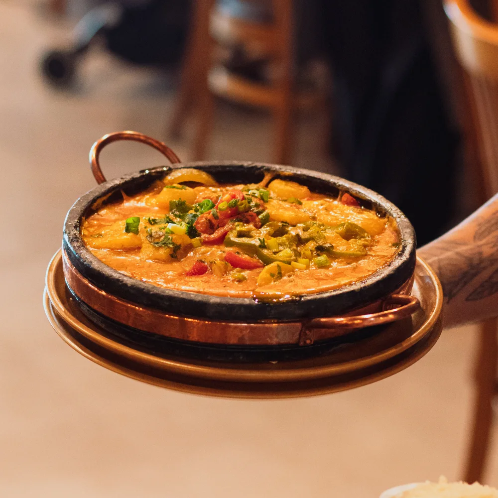 Moqueca da banana-da-terra, arroz branco e farofa vegana. Serve 1 pessoa.